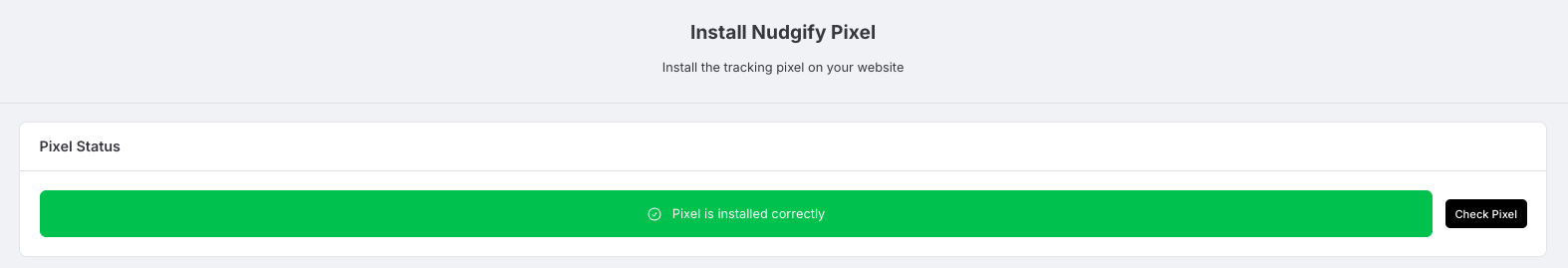- Do you see the green “Pixel installed” message? Congratulations, you have installed the Nudgify Pixel on your website and you will be able to see the Nudges you create on the targeted pages!