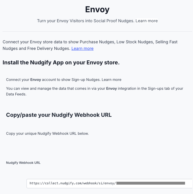 You will now paste your Nudgify Webhook URL in the right place in your Envoy account so that new user data is sent automatically to your Nudgify account.
