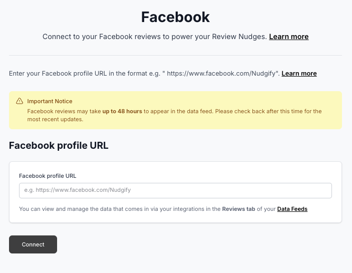 Click “Connect”. Your Facebook page URL has been saved and is now connected to Nudgify.