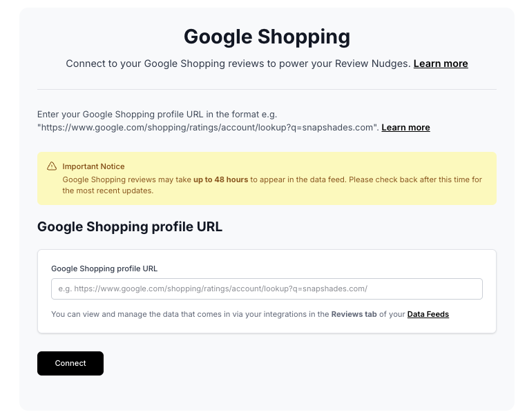 Click “Connect”. Your Google Shopping URL has been saved and is now connected to Nudgify.