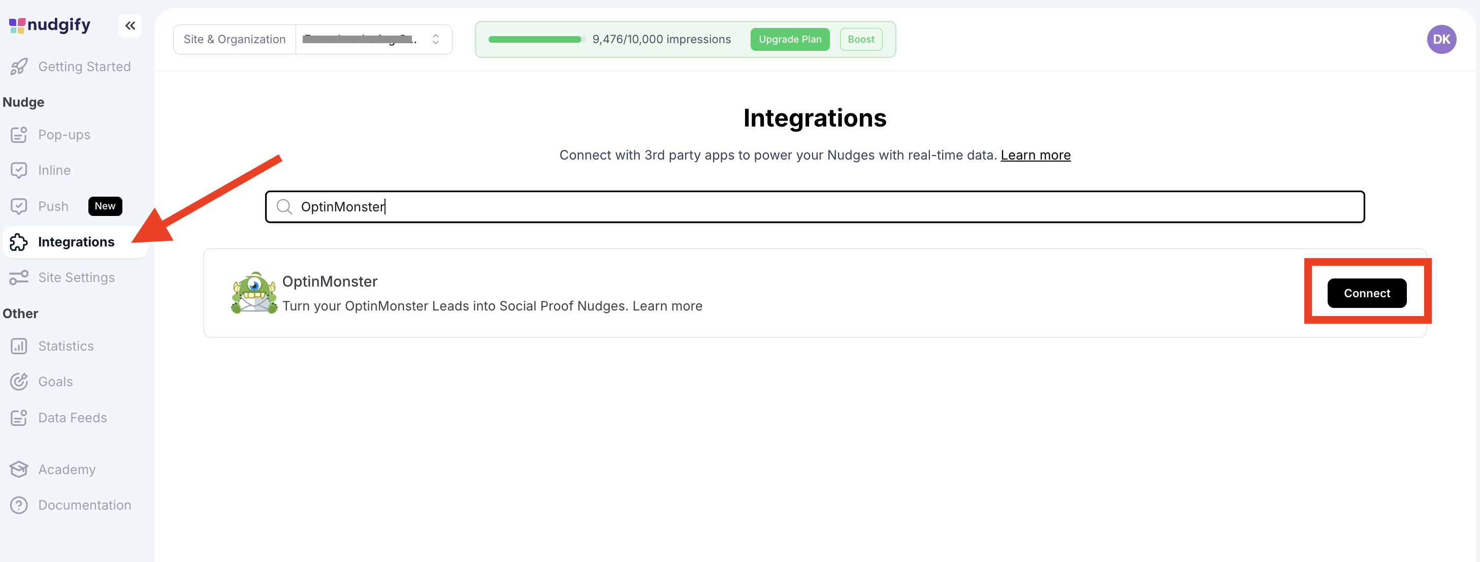 Follow the steps below to connect your OptinMonster user data to Nudgify and show new contacts in Sign-up Nudges.