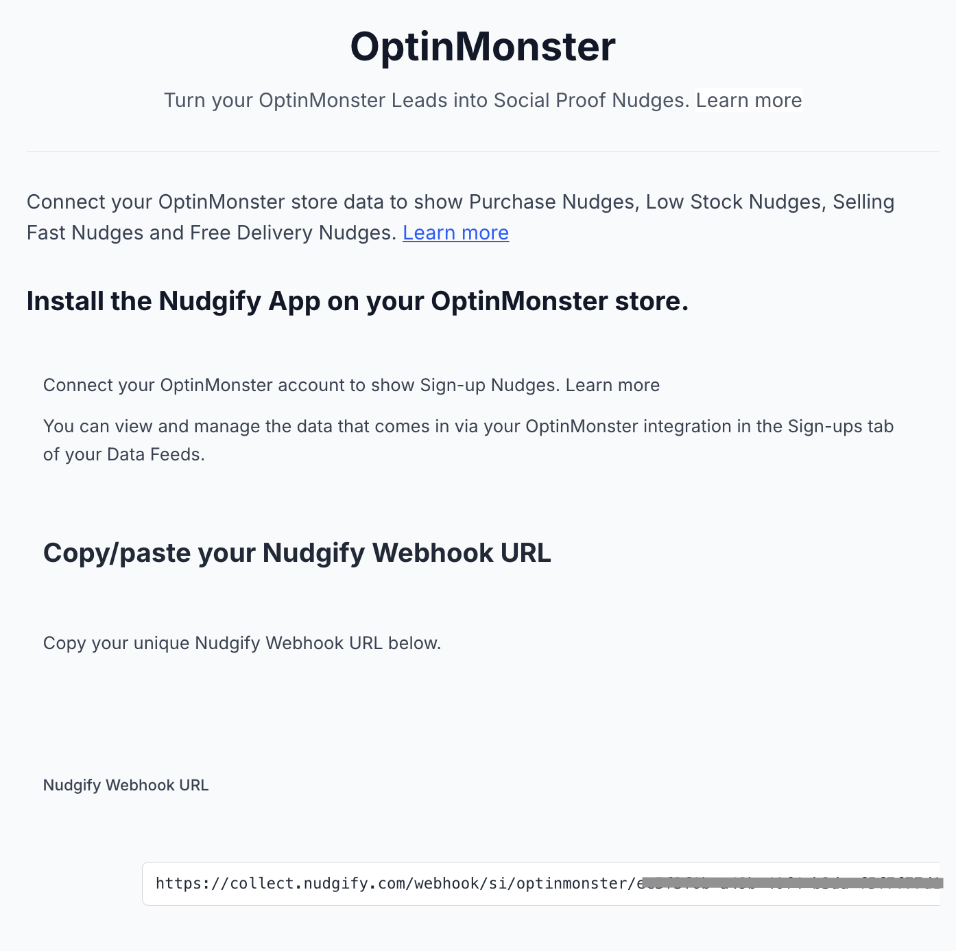 You will now paste your Nudgify Webhook URL in the right place in your OptinMonster account so that new user data is sent automatically to your Nudgify account.