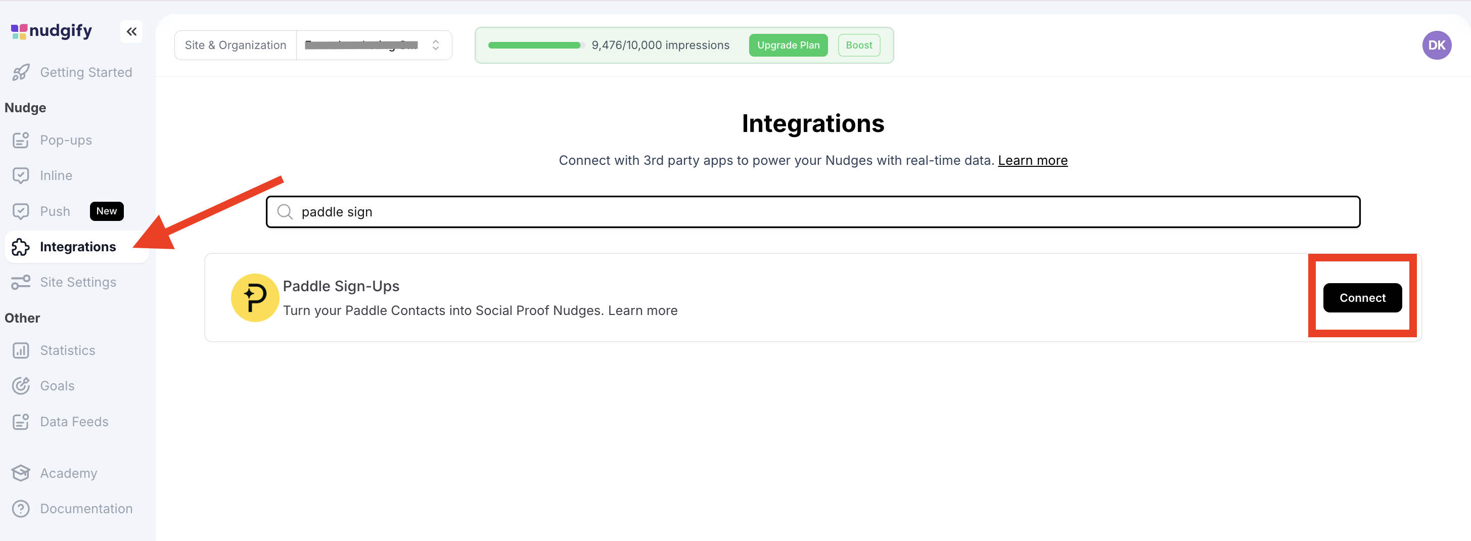 To manage your integrations, click the “Integrations” button on the left-hand sidebar. This will take you to the Integrations page, where you manage your integrations with other apps and software. Find Paddle Sign-Ups in the list and click “Connect”.
