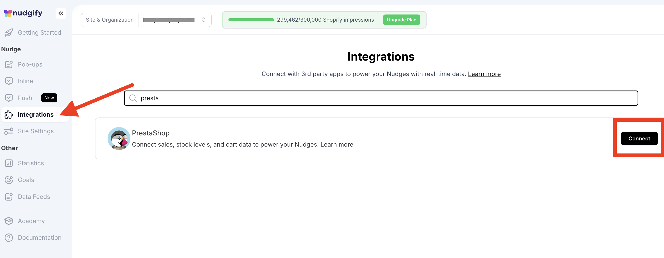 Just sign up for Nudgify and select PrestaShop as your integration.