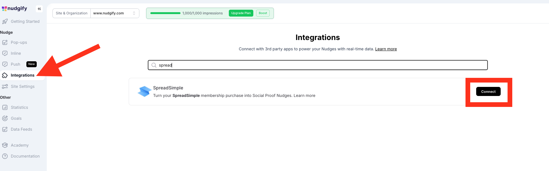 Follow the steps below to connect your SpreadSimple purchases data to Nudgify and show new registrations in Purchase Nudges.