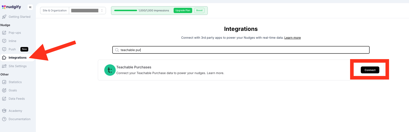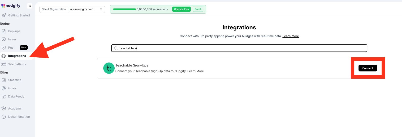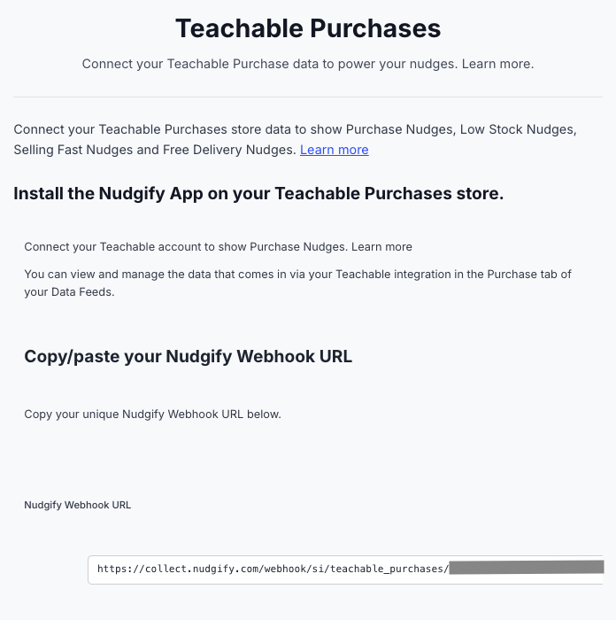 Notes: If you also want to install Nudgify on Teachable and display Nudges directly on your Teachable site, read Install Nudgify on Teachable.