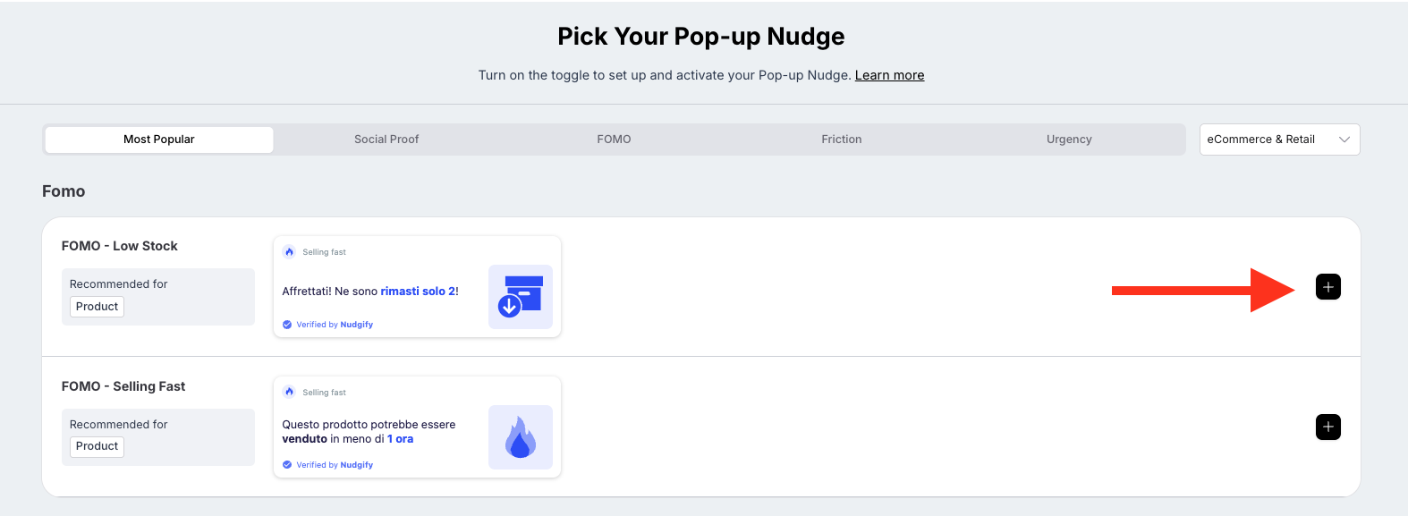Browse the library and select the type of Nudge you want to use (like Recent Activity, Low Stock, or a Custom Message)