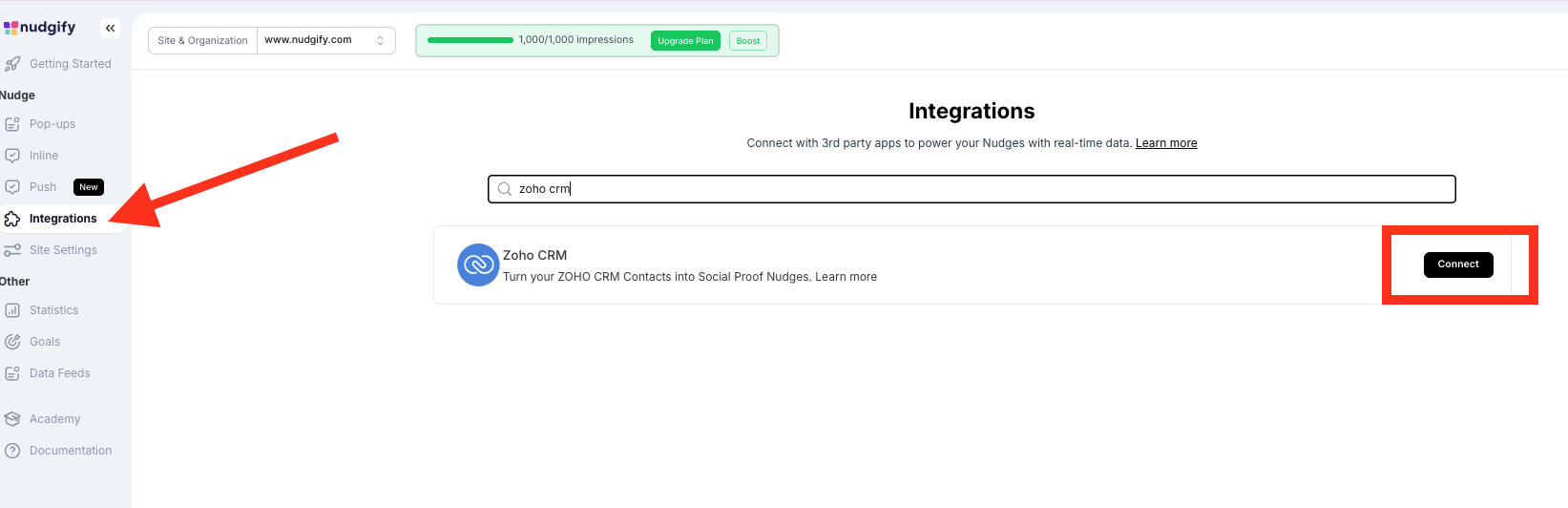 Follow the steps below to connect your Zoho CRM user data to Nudgify and show new contacts in Sign-up Nudges.