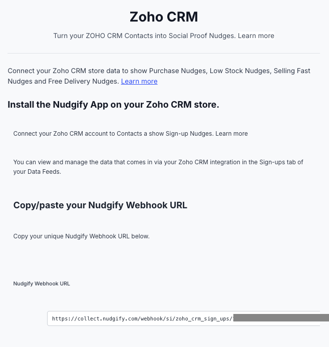 You will now paste your Nudgify Webhook URL in the right place in your Zoho CRM account so that new user data is sent automatically to your Nudgify account.