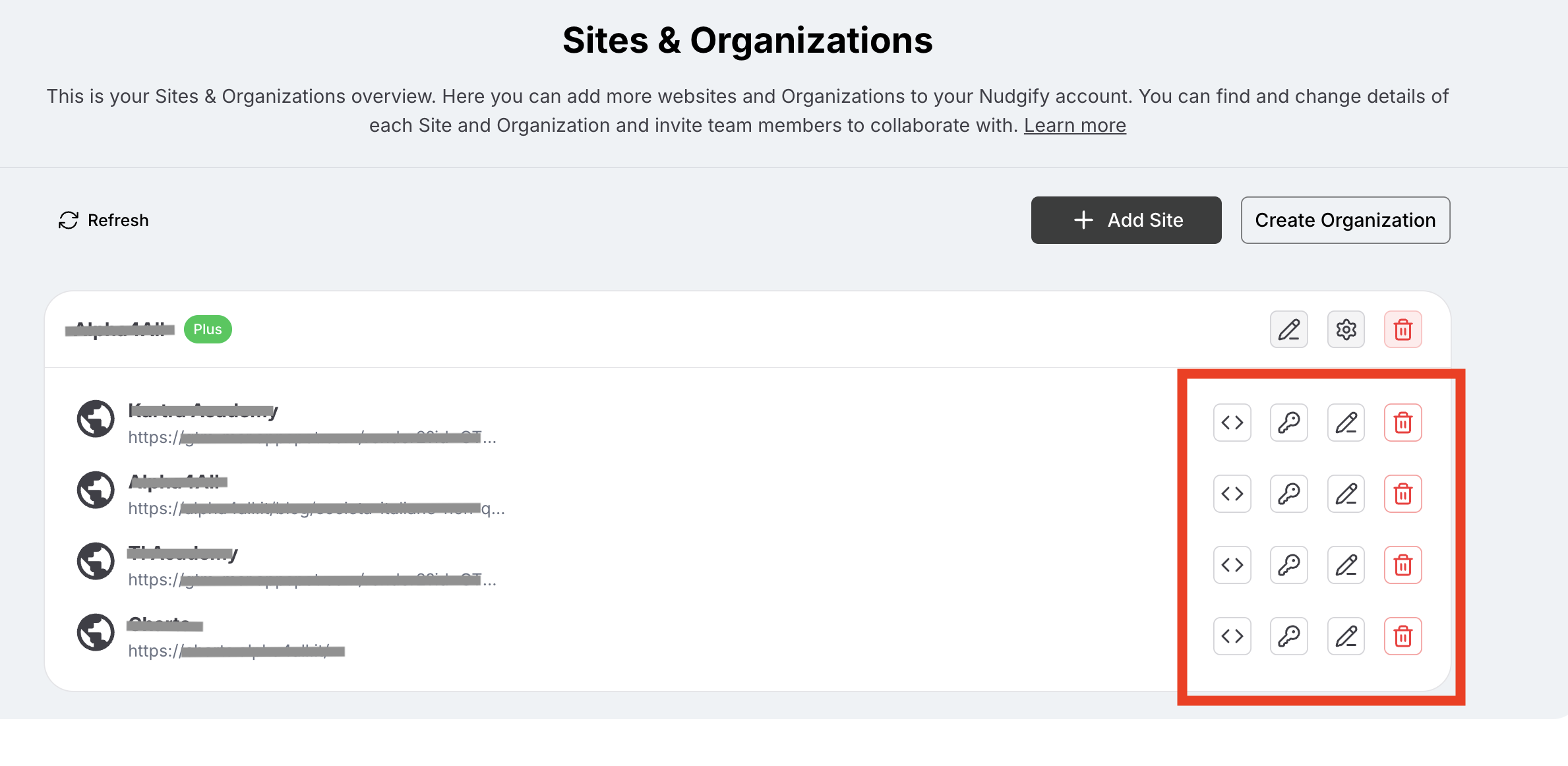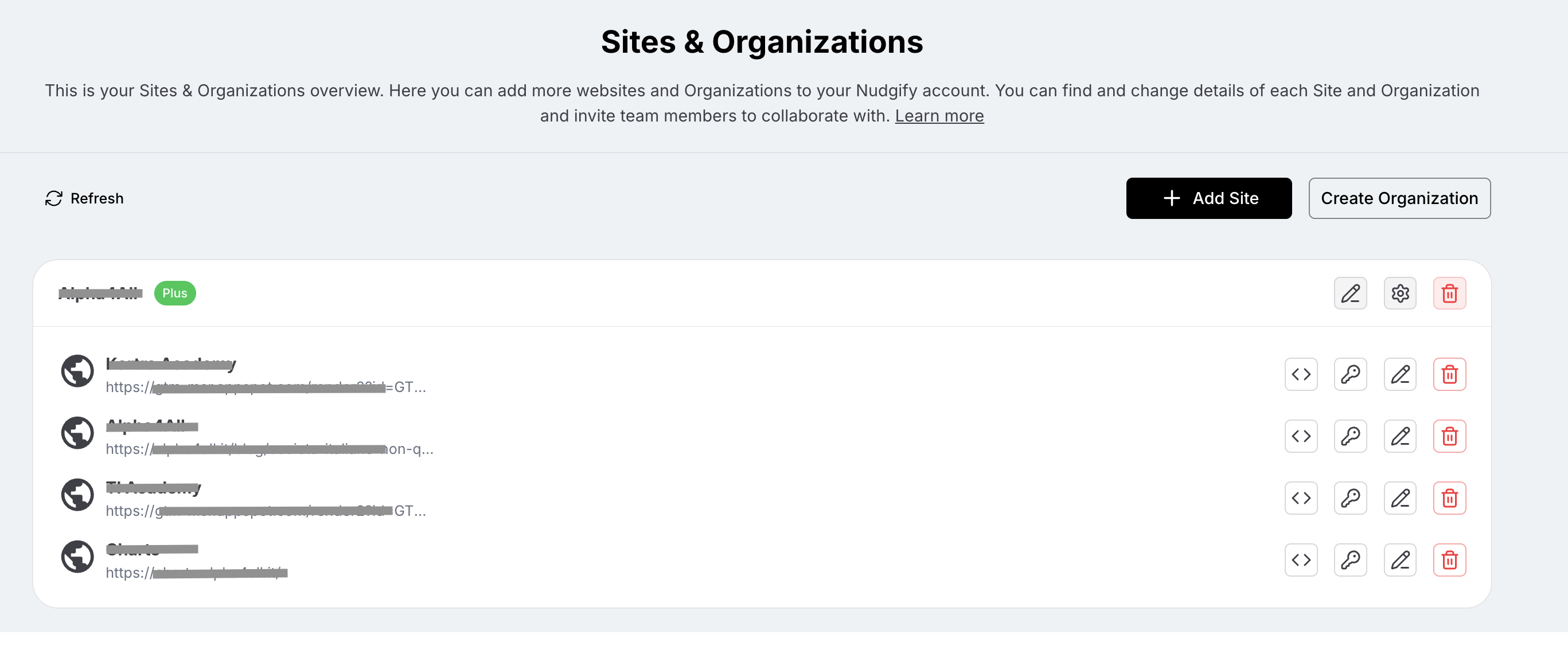 Editing: Click the Pencil Icon on the Sites & Organizations page to rename a site or fix a URL.
