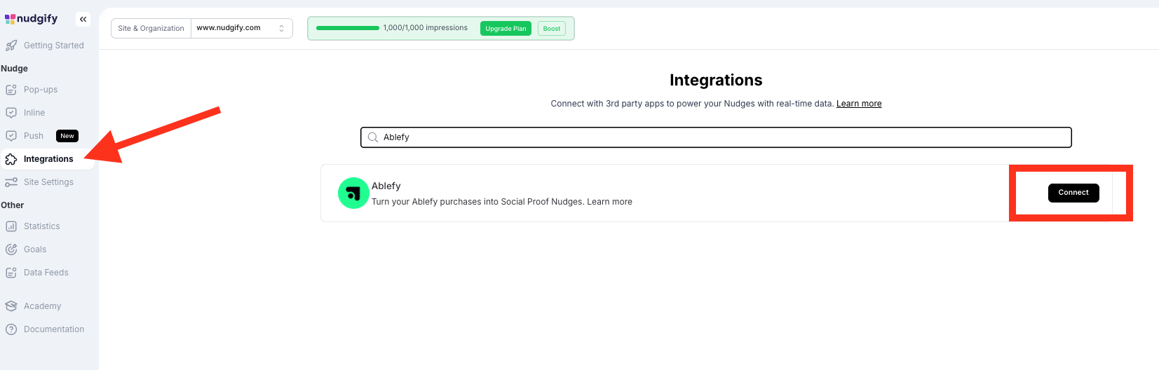 To manage your integrations, click the “Integrations” button on the left-hand sidebar. This will take you to the Integrations page, where you manage your integrations with other apps and software. Find Ablefy Purchases in the list and click “Connect”.