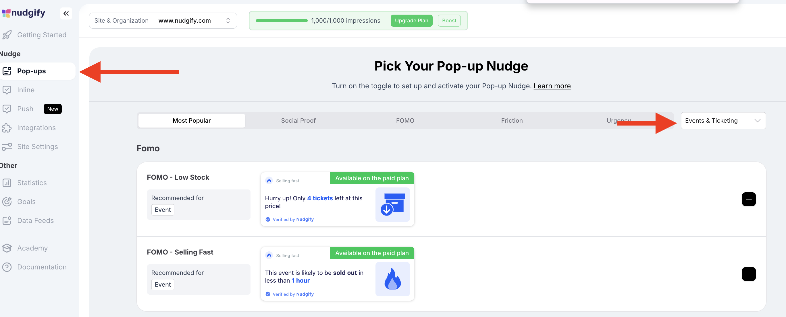 - You don’t have enough sales or your sales or not recent enoughIf the Ticket Sale Nudge does not show up, check the time frame you set. If you do not have any or enough sales within the time frame you set, the Nudge won’t show. For the All Ticket Sale Nudge, also check the minimum and maximum number of ticket sales you selected for the Nudge to show. When the amount of sales within the set time frame is less than the minimum you chose, the Nudge won’t show.