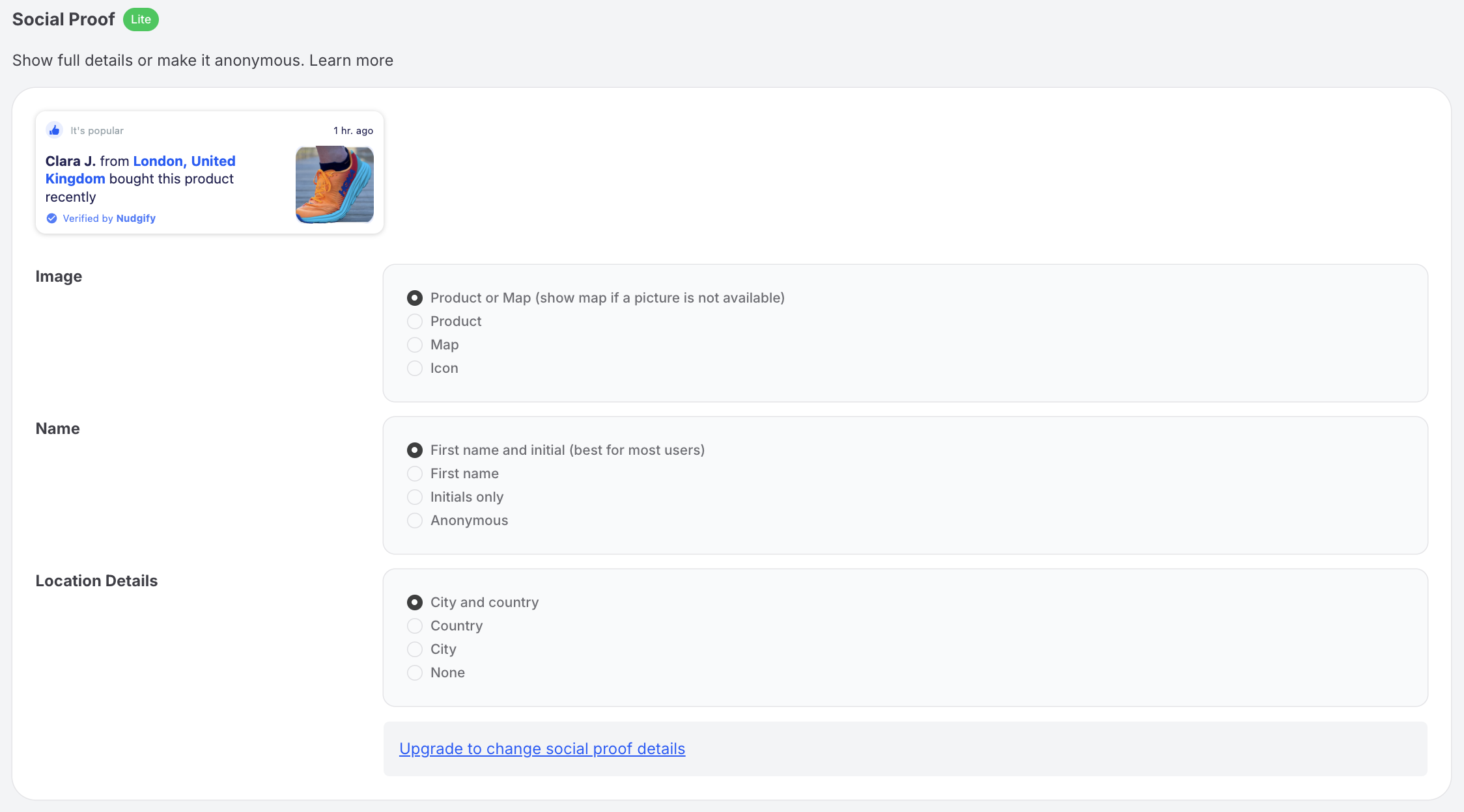 You can also choose in how much detail you wish to show the name and location of your buyers. By default, the Nudge displays: