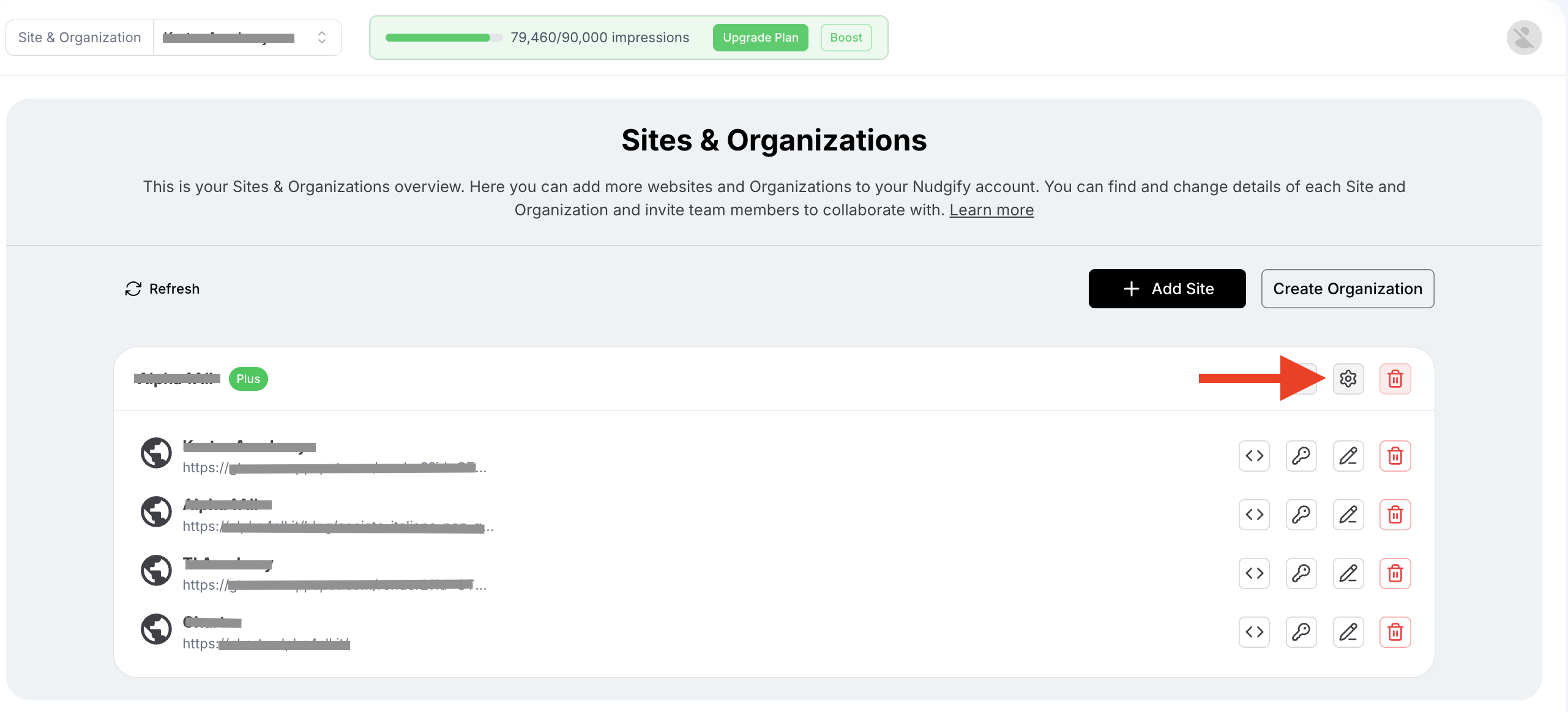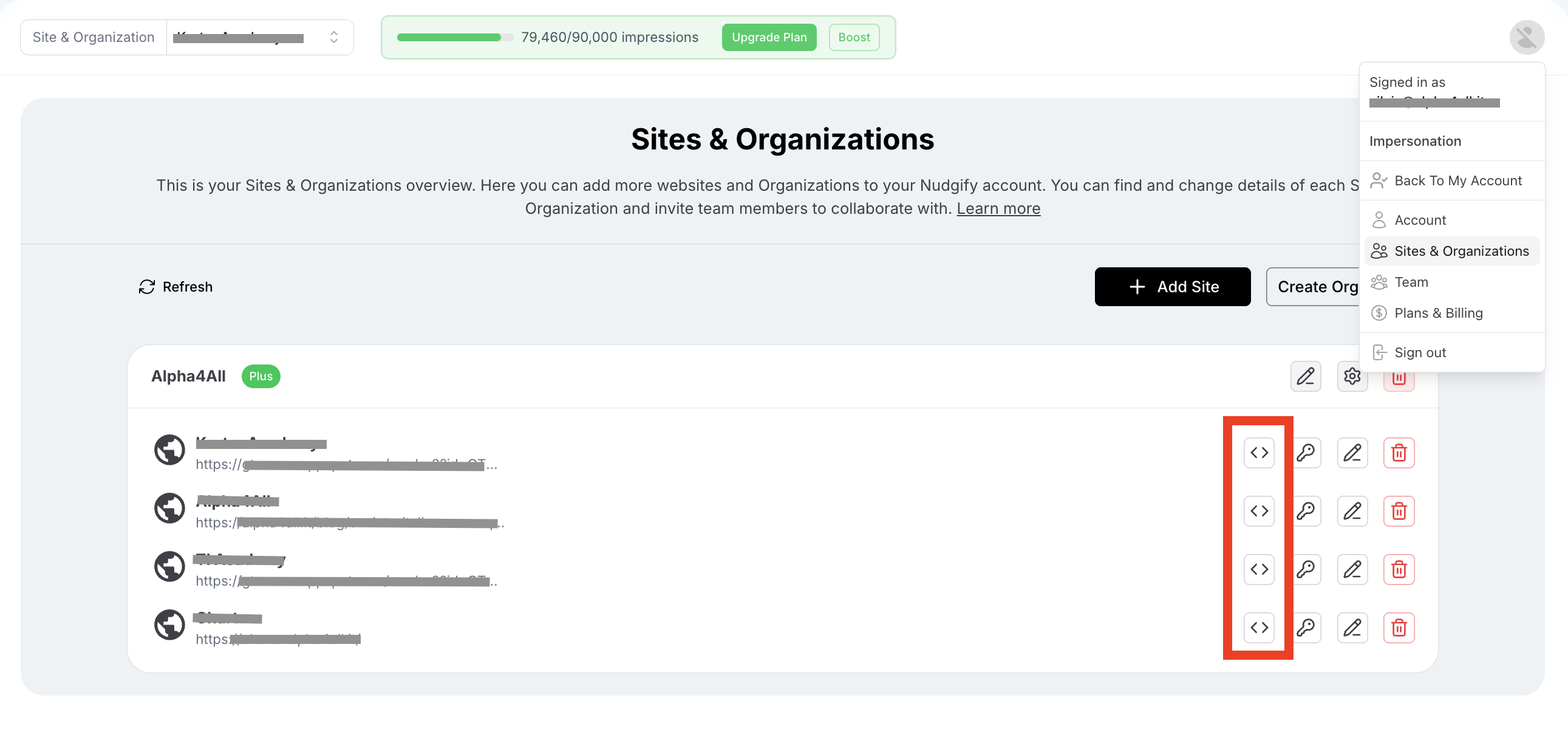 Each Site also comes with its own Nudgify Pixel. You can find the Pixel of each Site by clicking on on the <> icon in your Sites & Organizations overview.