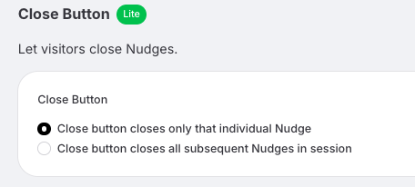 When you choose the second option,  the close button dismisses all Nudges for the rest of the visitor’s browsing session. When the visitor clicks the close button, that particular Nudge closes ánd the visitor won’t see any more other Nudges on your site.