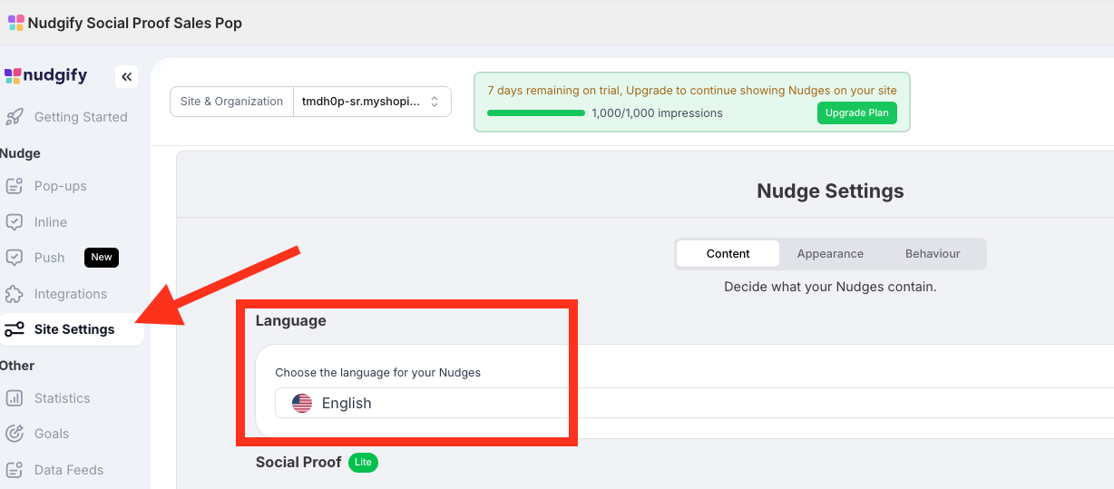 You can change the language of your Nudges in the Site Settings.