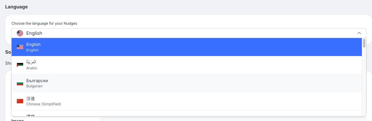 Nudgify offers 17 languages for your notifications. This way, you can localize your Social Proof messages and speak to your customers in their own language.