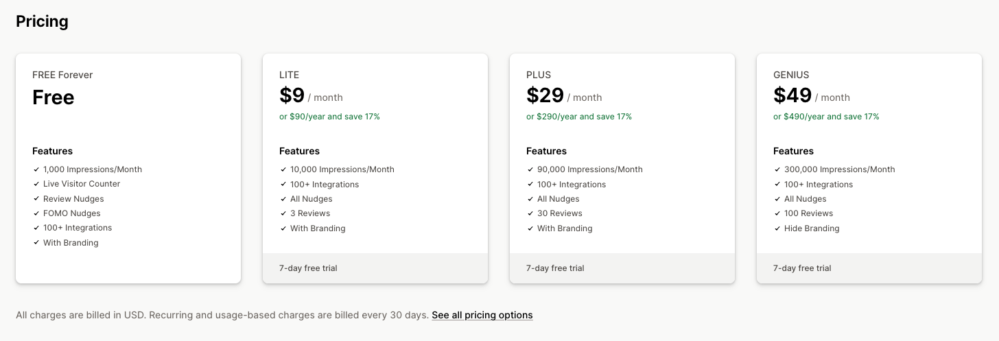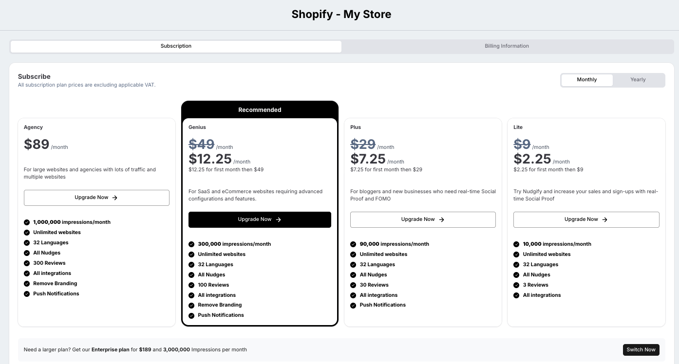 To see all plans, go to your Billing page. Nudgify offers five options: