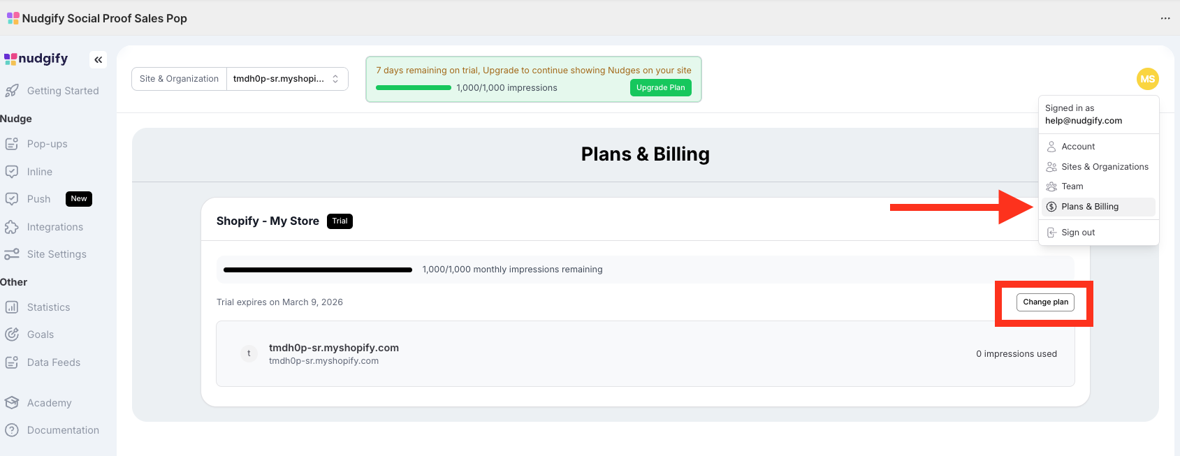 Once you’ve decided on the plan that’s right for you, log in to your Nudgify account, click your profile icon, go to Plans & Billing, and select Change Plan.