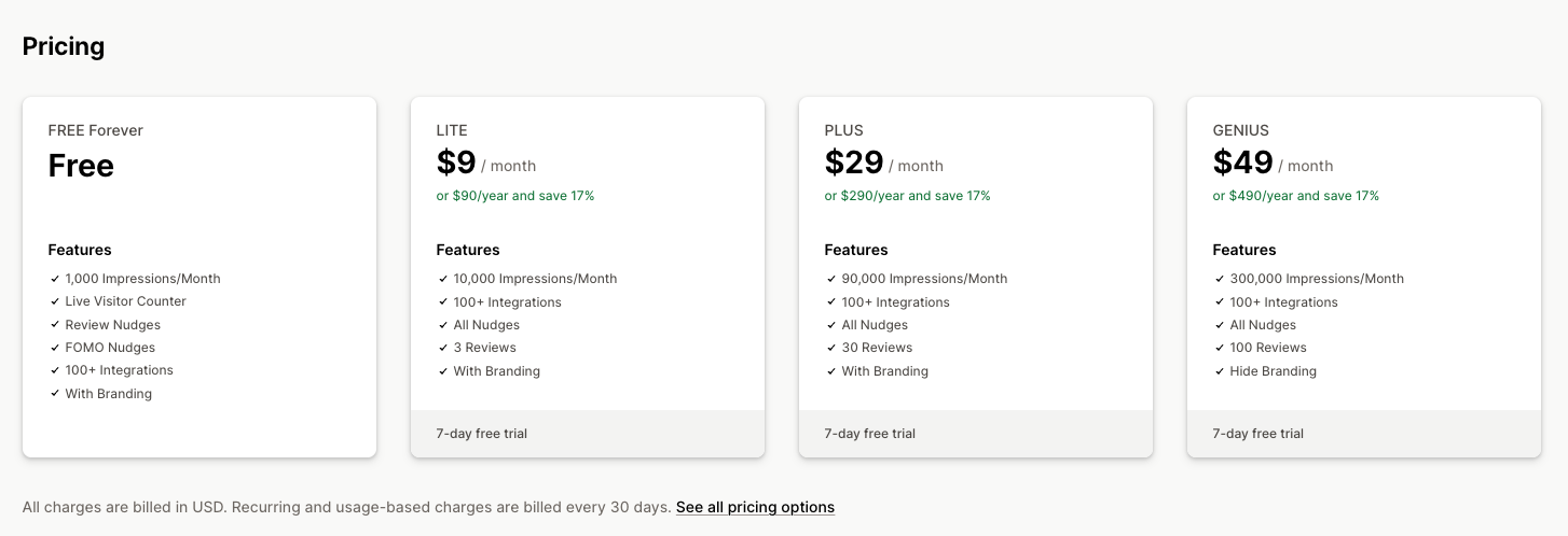 You can choose the plan that fits your store’s traffic and goals. For the full breakdown and latest details, you can always visit our Pricing page inside your Nudgify dashboard.