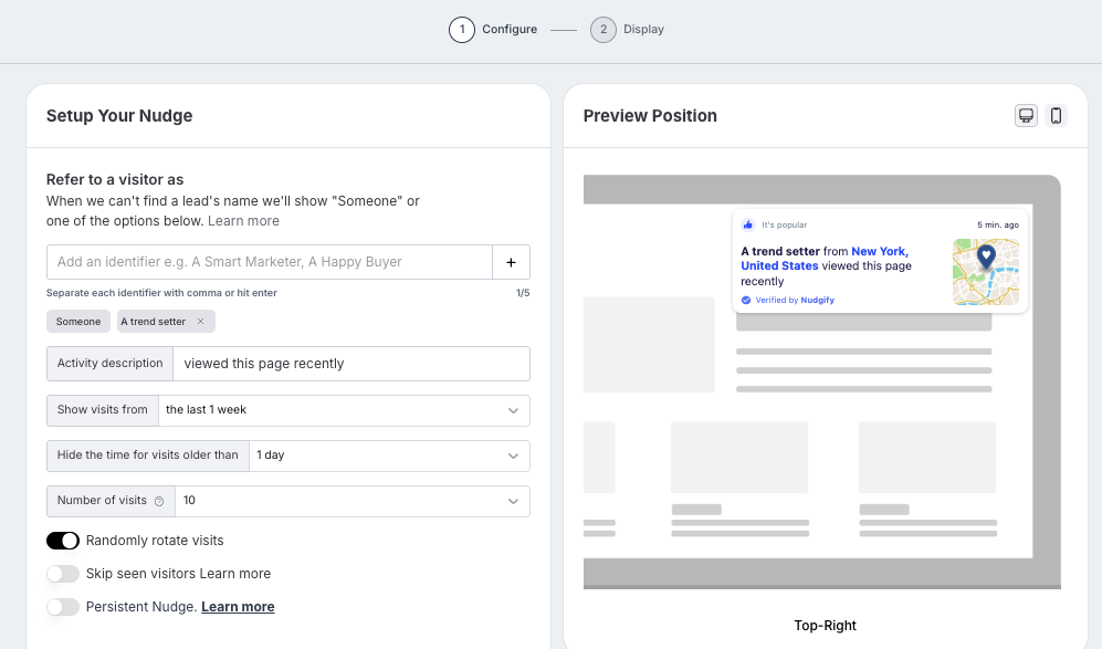 You can choose how recent the product views need to be for them to be displayed. This allows you to hide visits older than e.g. 12 hours. The largest time frame you can choose is 4 weeks. Nudgify does not collect data on views older than that.