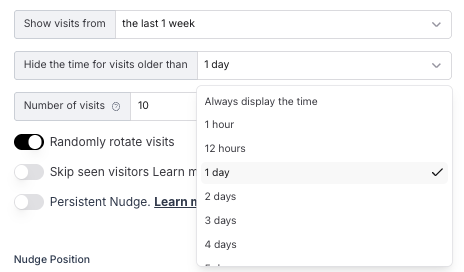 The Nudge will show the most visitors within the time frame you selected. For example, you select that you want to hide visits older than 12 hours. 25 people visited your page in the last 6 hours, but 47 visitors in the last 10 hours. Between 10 and 12 hours ago, no one visited your page. In this case, we will show the maximum amount of visitors, 47, in the smallest time frame, 10 hours. The Nudge will say ’47 people viewed this page in the last 10 hours’.