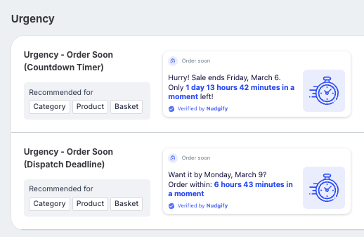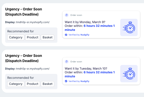 If you want to show different deadlines for different products, you can create multiple versions of the same Order Soon Nudge. Simply duplicate or add another Order Soon Nudge and set a different deadline for each one.