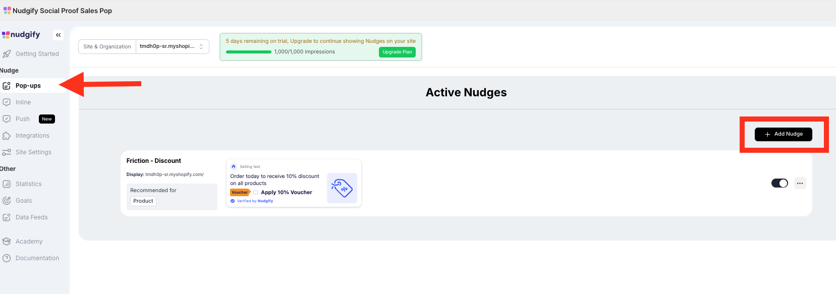 Step 1: To add it to your product pages, go to the Pop Ups tab and click + Add Nudge.