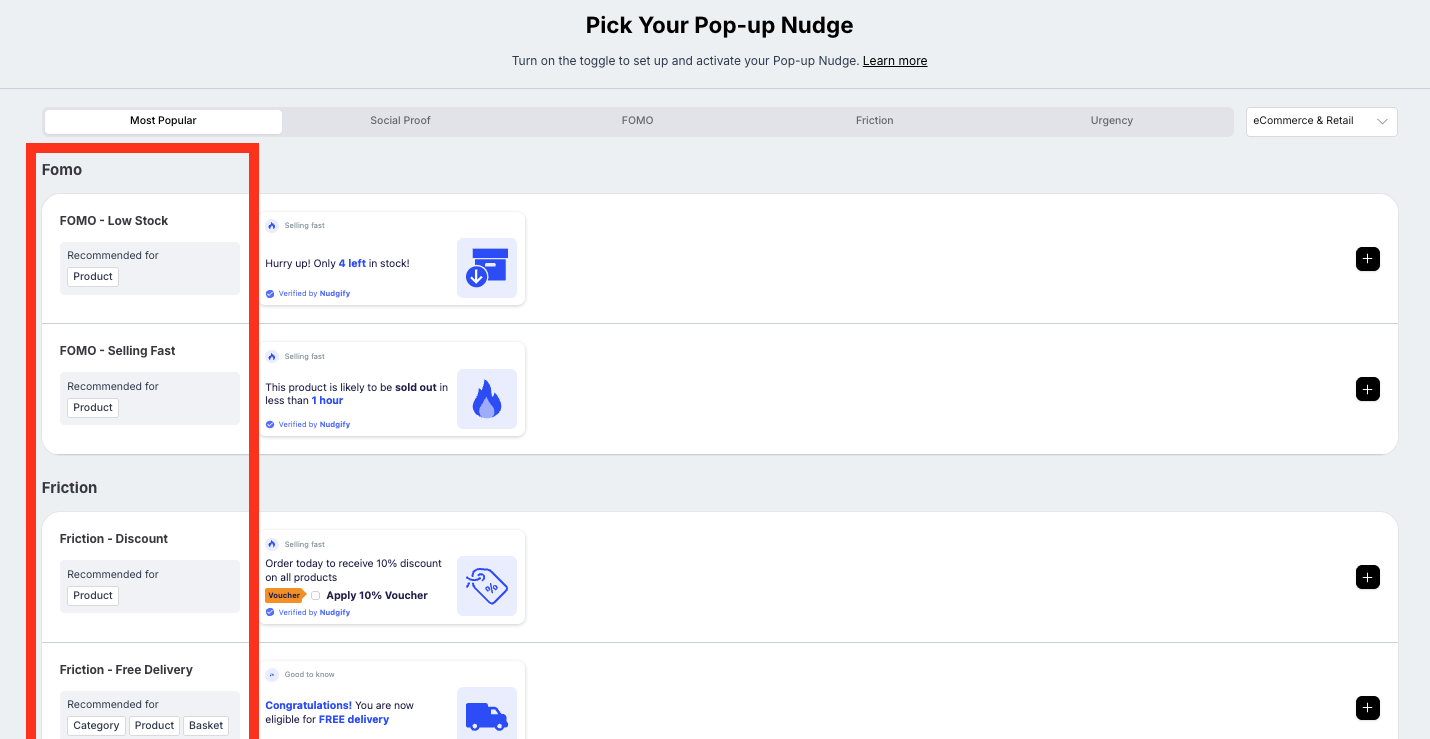 The Nudges that are recommended for a particular page are chosen specifically for that part of your sales funnel. The ‘Recommended for’ tags help you decide which Nudges to add to which pages.