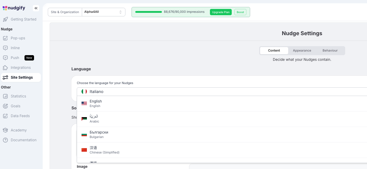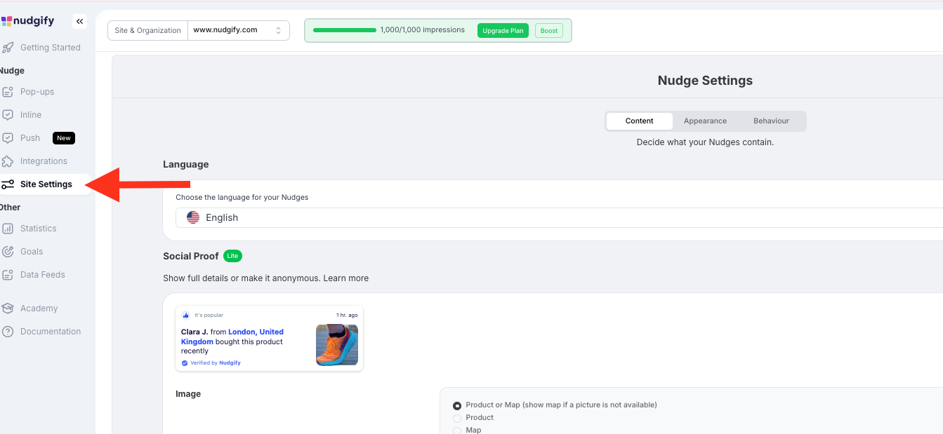 In your Site Settings, you can choose the language, appearance, and behavior of your Nudges. These settings help ensure your Social Proof notifications match your website and the way you communicate with your customers.