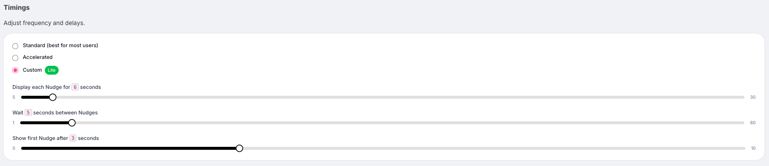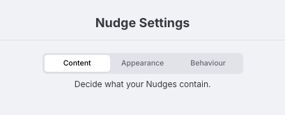 In the Behaviour tab, you can control how long Nudges appear, how quickly they appear after one another, and when the first Nudge is displayed.