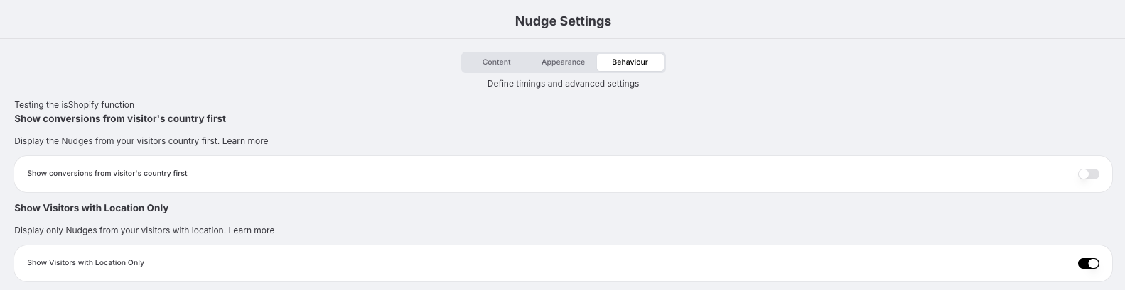 In Site Settings, under the Behaviour tab, you can choose whether to display Nudges only when a visitor’s location is known.