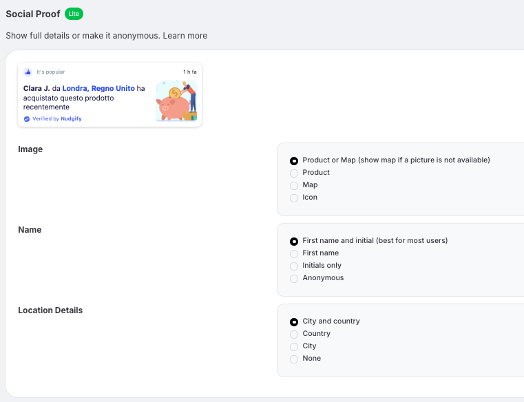 By default, Nudgify shows the visitor location, and for recent activity it may also show the name and product.