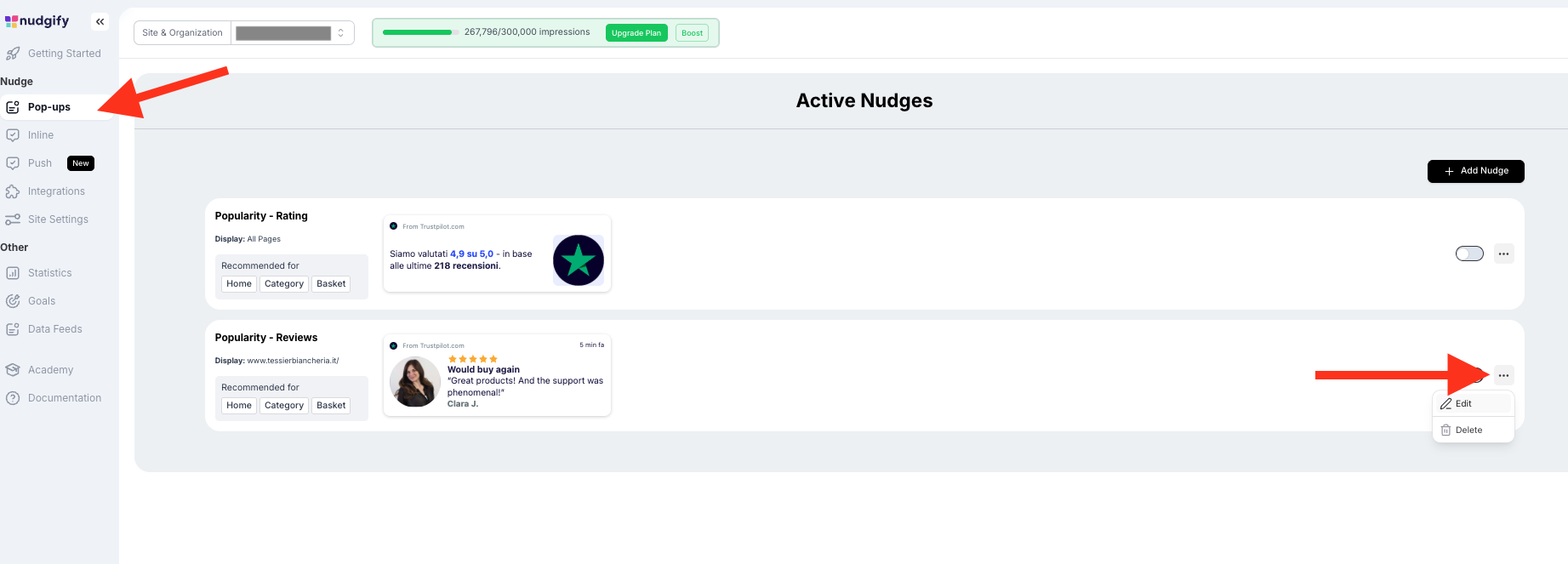 To edit a specific Nudge after adding it, go to the Pop Ups page and click the three dots on the right side of the Nudge, then select Edit to open it.