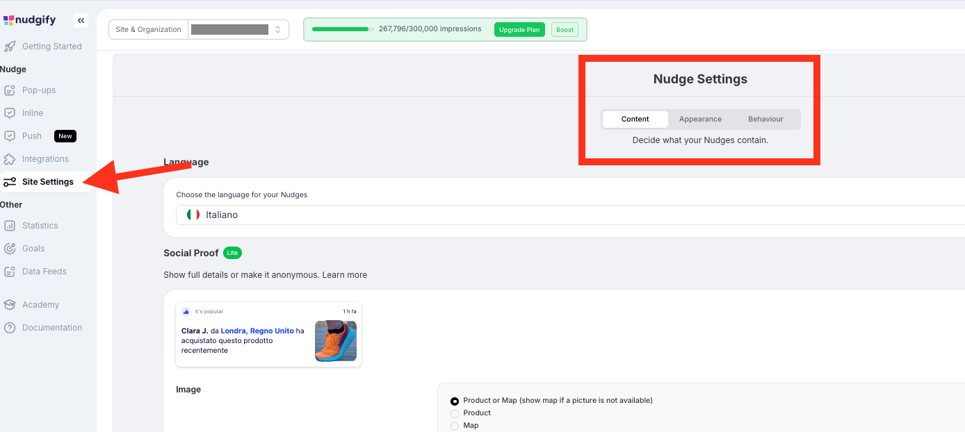 In your Site Settings, you can change the settings that apply to all your Nudges. These include the highlight color, position, and language of your Nudges.