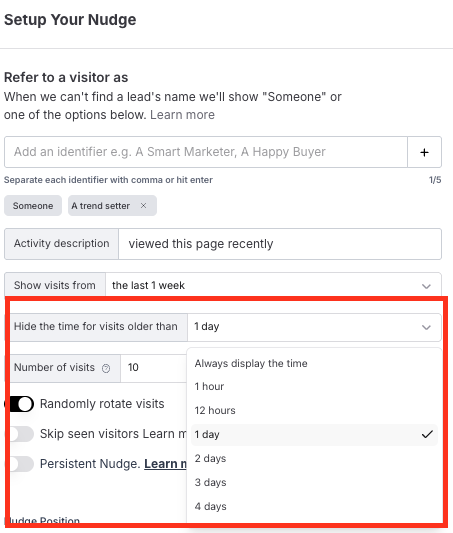 This means the Nudge will still appear, but the time label such as “5 minutes ago” or “2 days ago” will not be shown if the activity is older than your chosen limit.