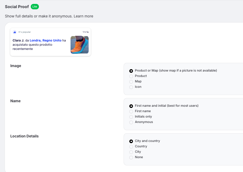From your Nudgify account (all plans), you can change the Location default settings to select the type of location data you want to show to your site visitors. Whether it be – City only, Country only, Country and City, or None (if you want to location shown at all to your visitors).
