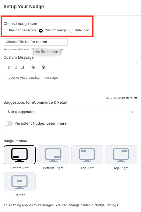 For Custom Nudges, you can choose one of our pre-defined icons or upload your own custom image to show in your notifications.