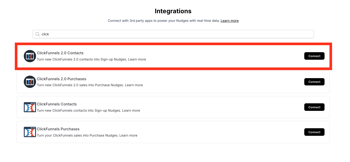 You can connect two types of ClickFunnels data to Nudgify: sales and sign-ups. You can use our ClickFunnels Contacts Integration to connect new contacts that are added to your list, and show them in Sign-up Nudges. You can use our ClickFunnels Purchases Integration to connect your and our ClickFunnels sales, and show them in Purchase Nudges.
