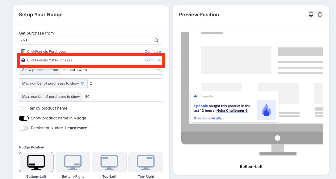 You can now configure this Nudge. First of all, select “ClickFunnels 2.0 Purchases” as the data source. This way, the Nudge will use your ClickFunnels data to show in the Nudge.