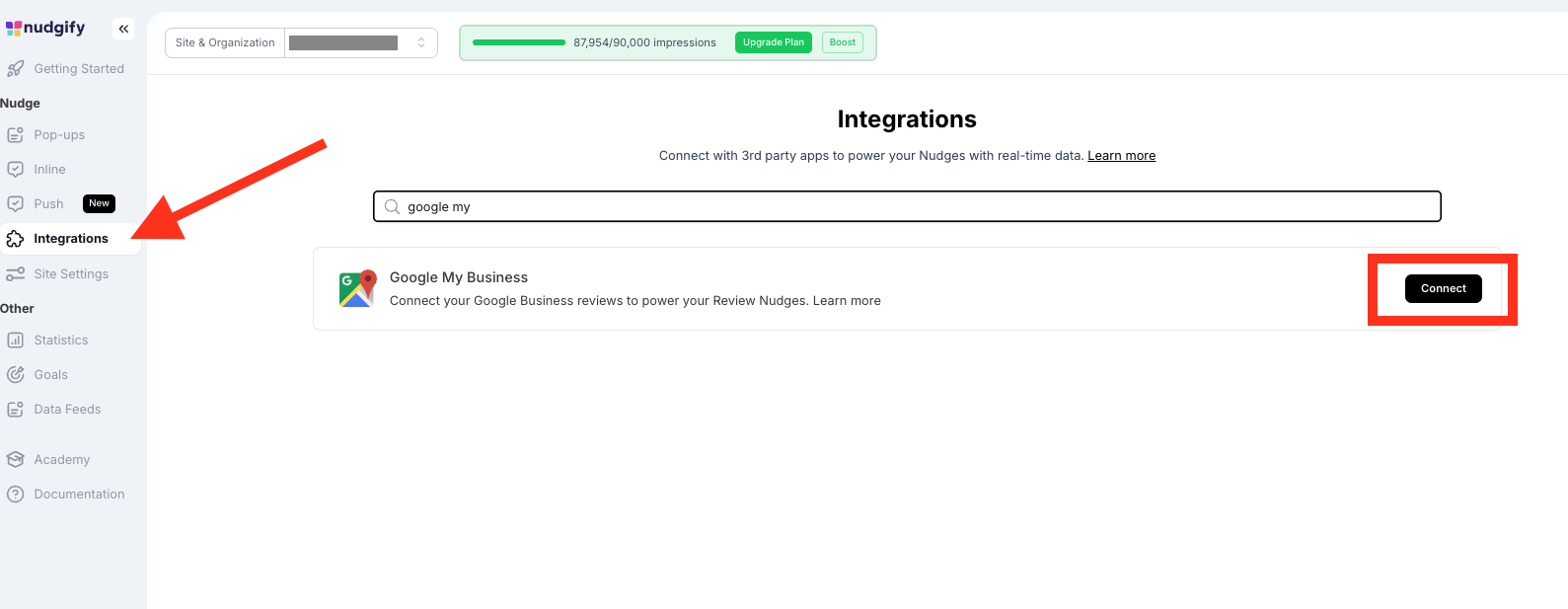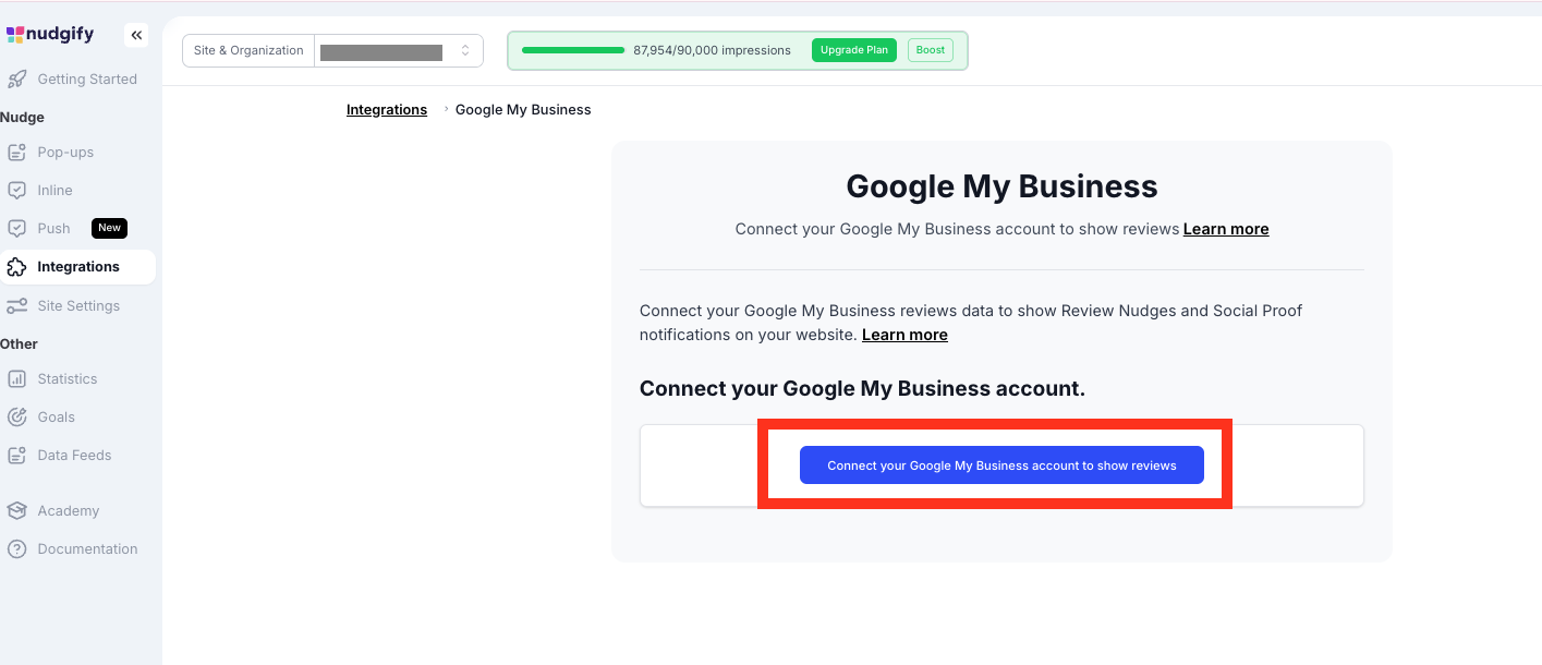 In order to connect your account to Nudgify, click “Connect your Google My Business account to show reviews”.