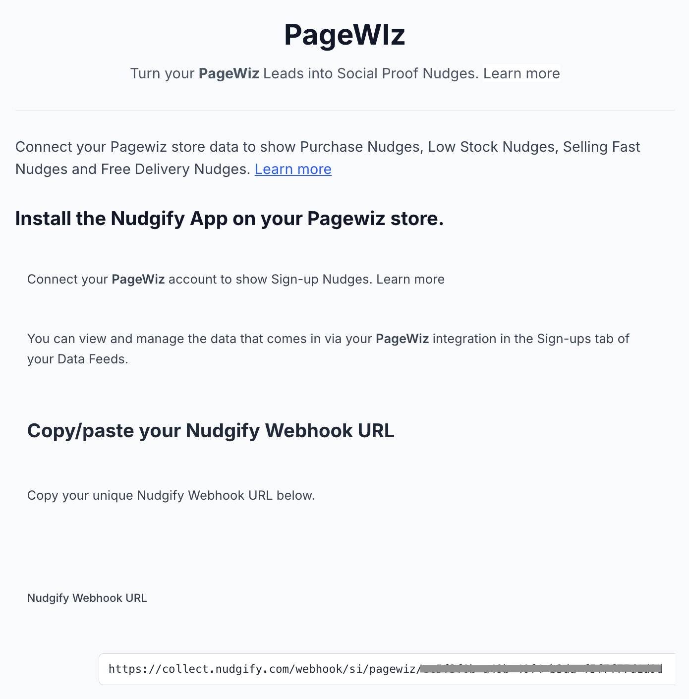You will now paste your Nudgify Webhook URL in the right place in your PageWiz account so that new user data is sent automatically to your Nudgify account.