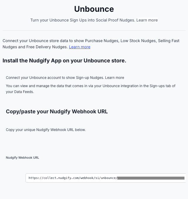 You will now paste your Nudgify Webhook URL in the right place in your Unbounce account so that new user data is sent automatically to your Nudgify account.