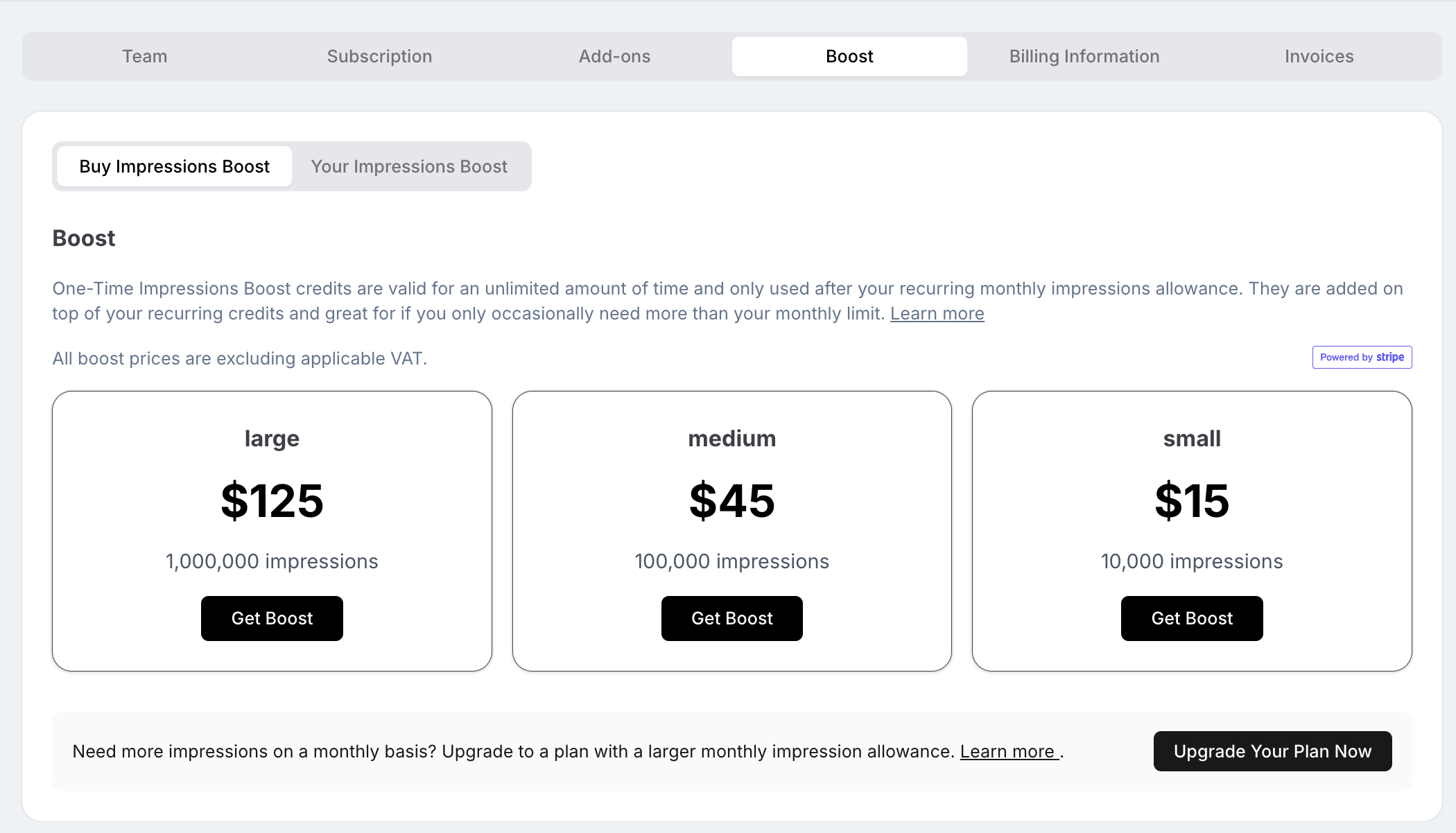 If you aren't ready to move to a larger monthly plan, you can purchase an Impression Boost. A Boost is a one-off purchase of extra credits. Unlike your monthly plan allowance, Boost credits never expire. They are ideal if you have a seasonal spike in traffic or just need a little extra room to get through the month.