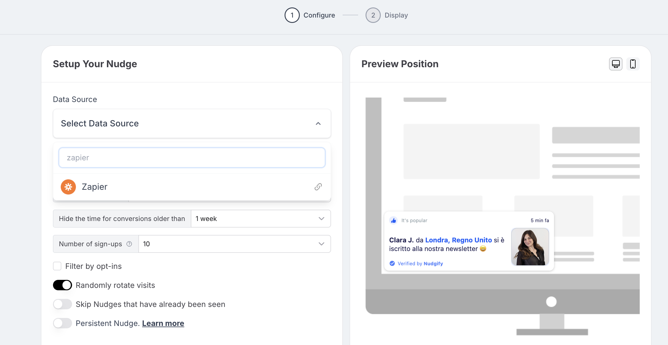 You connect Mailjet to Nudgify using Zapier. Every new Mailjet sign-up can then appear as a Nudge on your site.