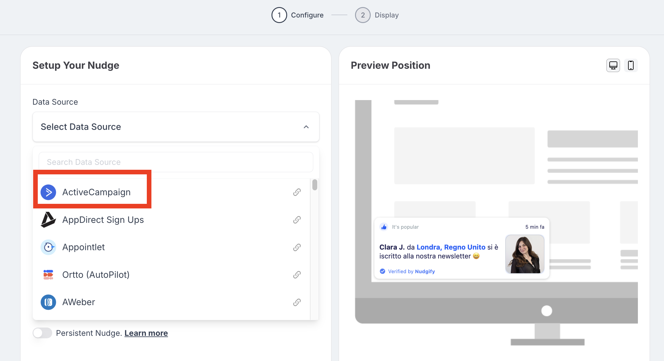 You can now configure the selected Nudge. First of all, select “ActiveCampaign” as the data source. This way, the Nudge will use your ActiveCampaign data to show in the Nudge.
